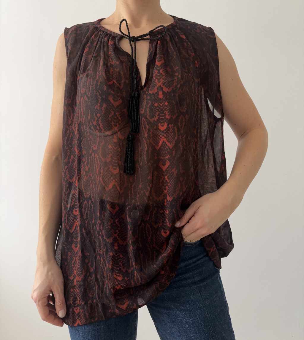 Mango mintás, gyöngyös megkötős blúz.