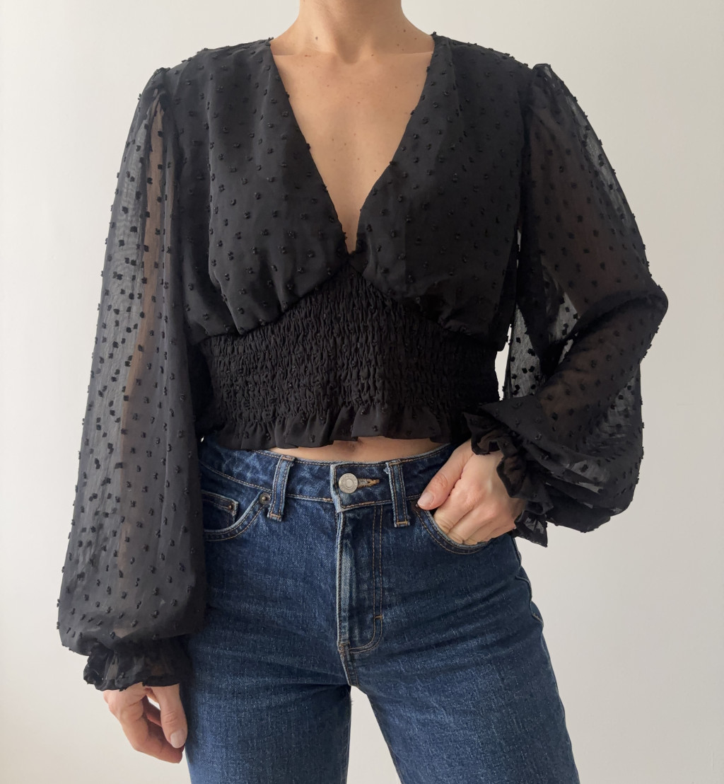 Shein fekete, nyomott mintás, darázsolt felső.