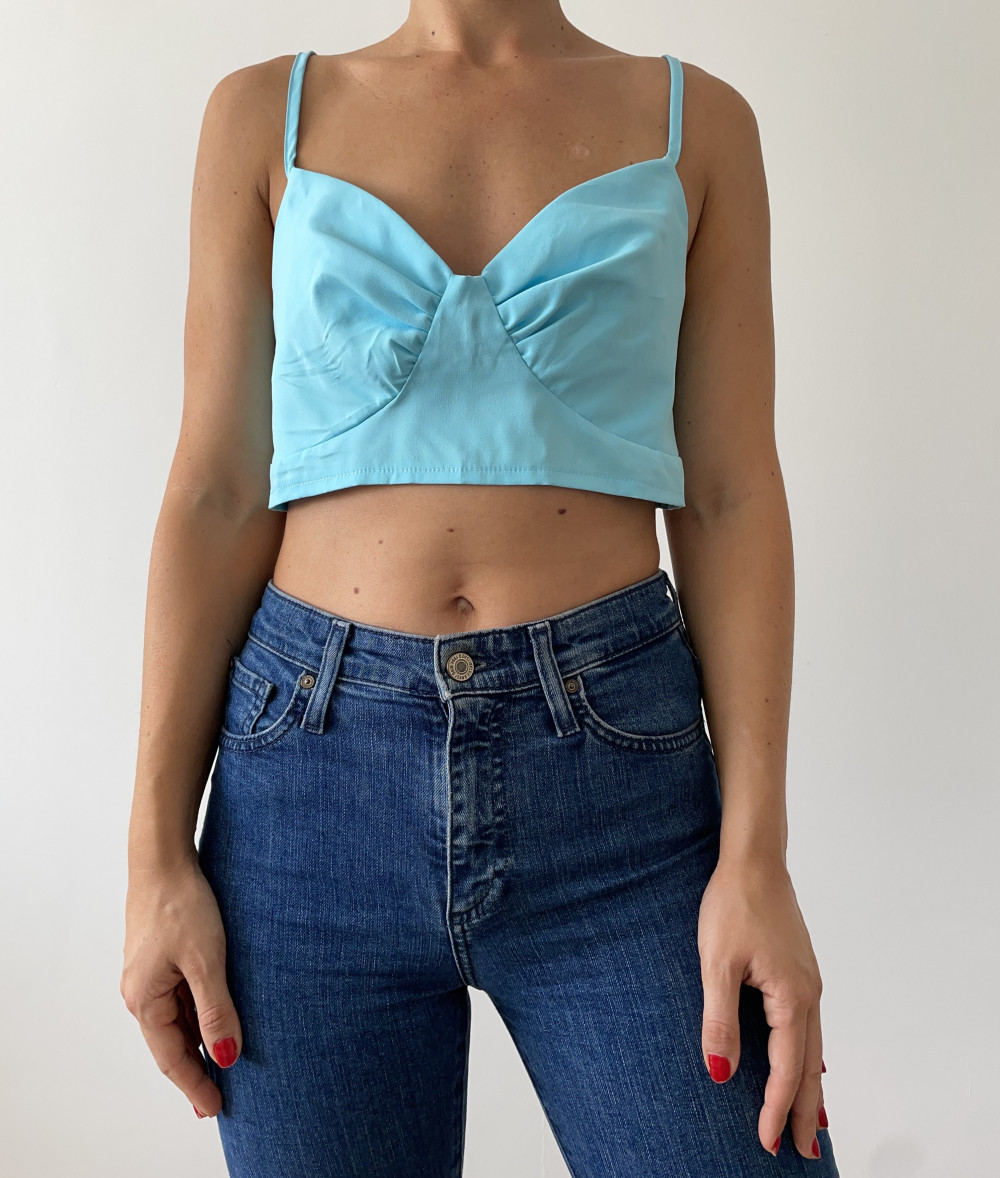 Shein kék top. Hátul darázsolt.